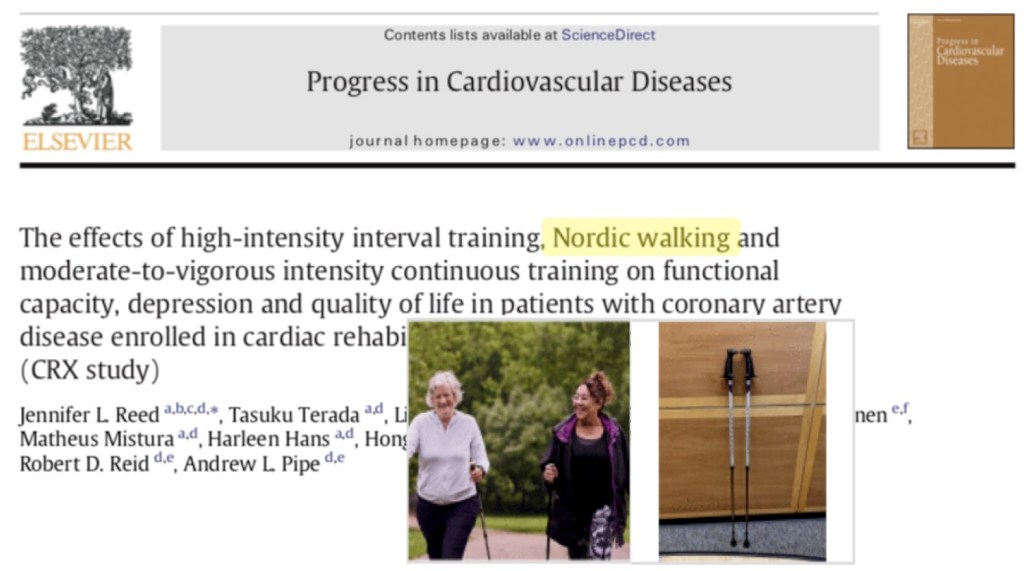 Un estudio publicado el año pasado revela que distintas intervenciones de ejercicio mejoran la capacidad funcional de pacientes de enfermedad coronaria, sin embargo, la intervención en la que se empleaba una caminata asistida con bastones produjo resultados significativamente mejores. A pesar del título del trabajo, un vistazo a las figuras que lo acompañan en la web sugieren que se trata de caminata con bastones pero no de marcha nórdica…